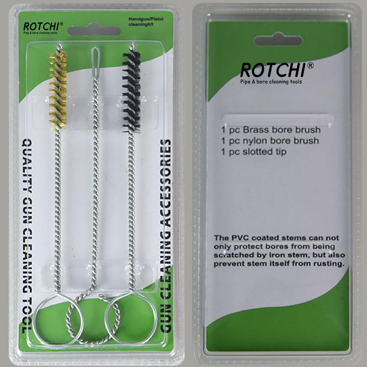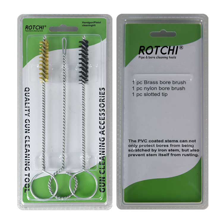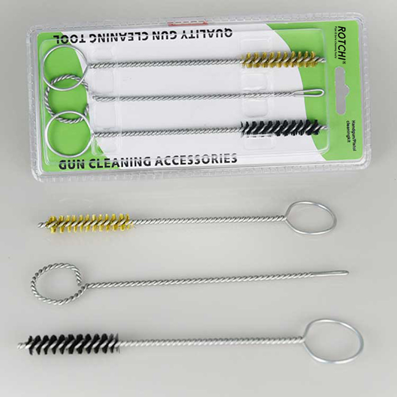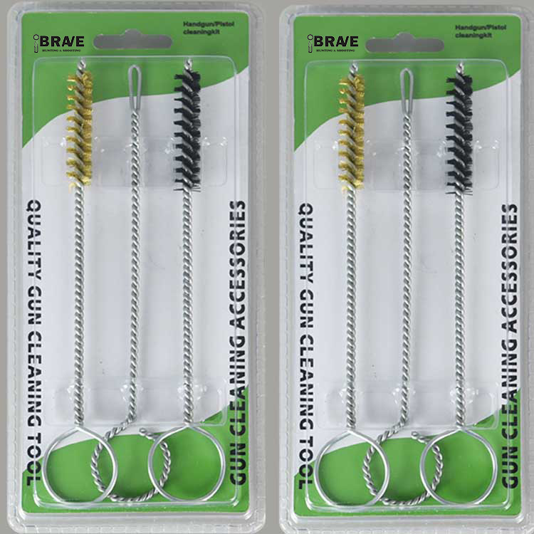 3 шт. набору для чищення гармат, упакованих у подвійний блістер. Одна латунна щітка для чищення отворів, одна нейлонова щітка для чищення отворів і один тримач для накладки з прорізами. Зручно та ефективно.