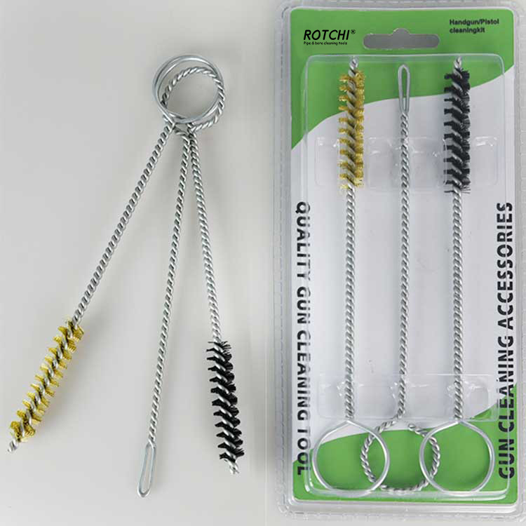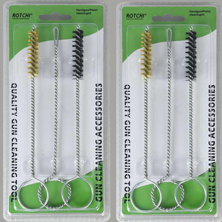 Набір для чищення пістолетів 9 мм у блістерній упаковці 3 шт. набору для чищення гармат, упакованих у подвійний блістер. Одна латунна щітка для чищення отворів, одна нейлонова щітка для чищення отворів і один тримач для накладки з прорізами. Зручно та ефективно.