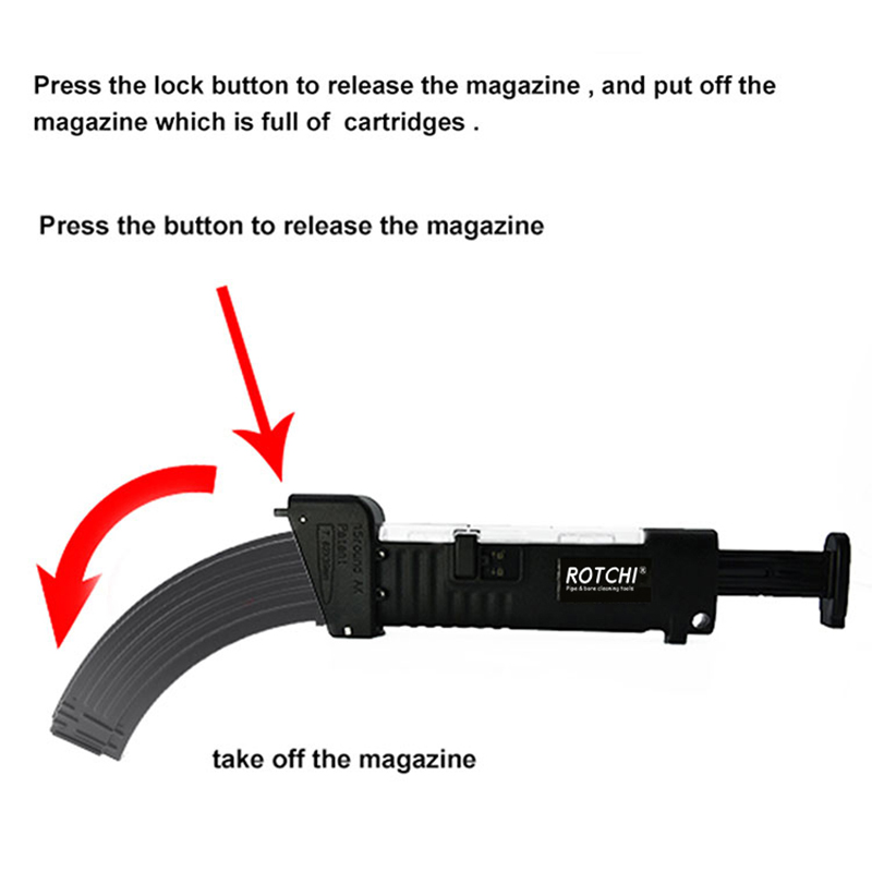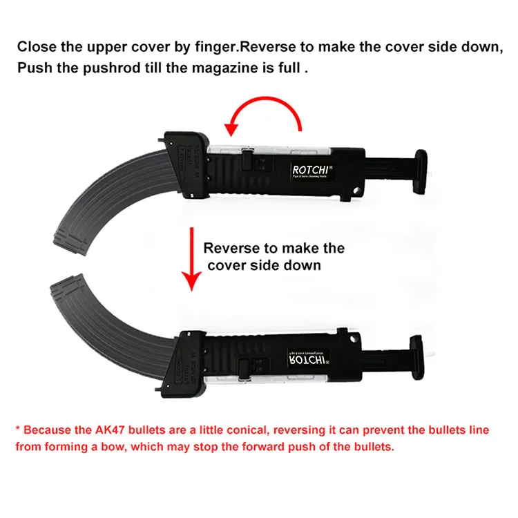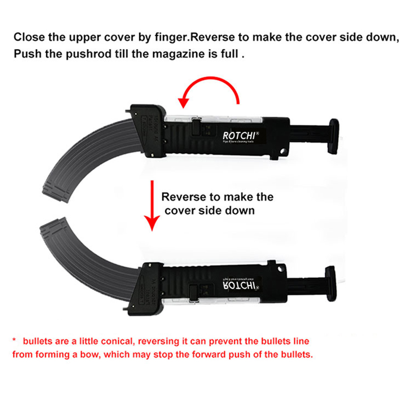 Швидке завантаження магазину для AK47 ● Використовується для завантаження патронів 7,62X39 мм у магазин АК ємністю 10/20/30 або більше. ● Заповніть патрони повністю в паз, встановіть магазин за таким же механічним принципом, як і для АК. натисніть на штовхач, патрони легко ввійдуть у магазин. ● Легко керувати, дівчина може зробити це дуже швидко. ● Міцне тіло. Ви можете бачити патрони всередині заряджання через захисну кришку. Замок контролює, щоб кришка не відкривалася під час зберігання. ● Він також може вивантажувати патрони з магазину, коли ви не збираєтеся стріляти, але магазин усе ще повний.