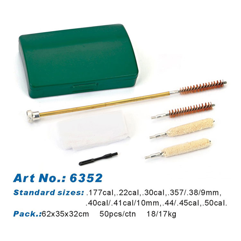 Набір для чищення пістолета з вигнутим пластиковим футляром. Вигнутий пластиковий корпус не ковзає по столу. 2 латунні щітки та 2 бавовняні швабри. Якщо один закінчився, можна використати наступний. Добре підходить для чищення пістолетів калібру 9 мм.